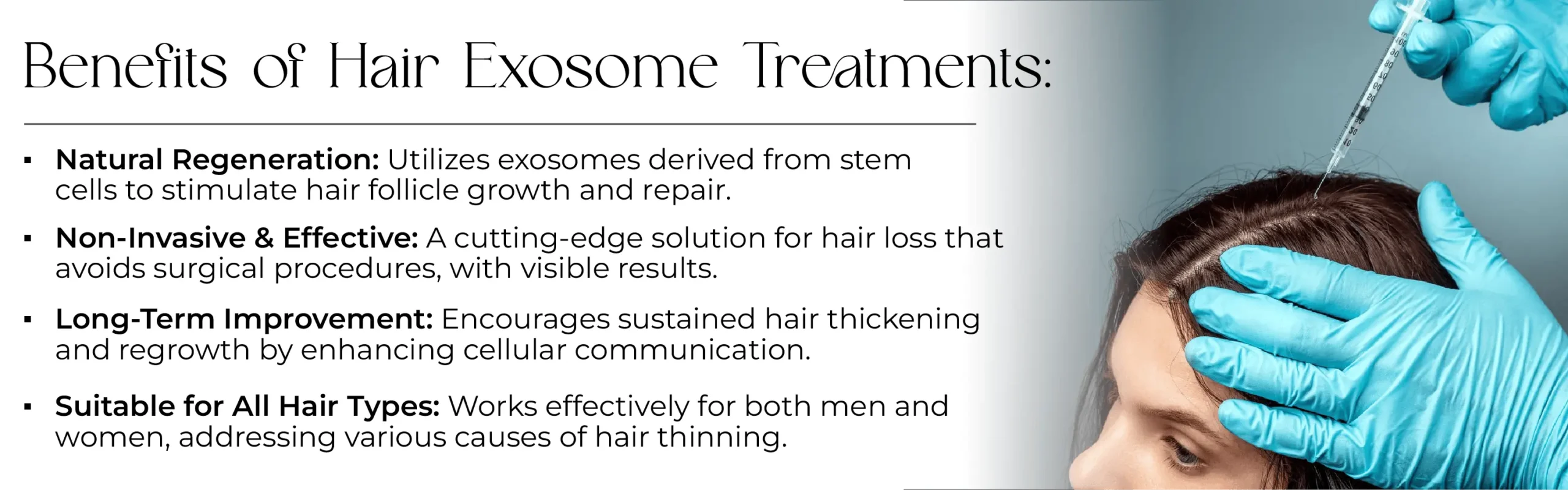 After the exosomes have been separated and prepared, our team will inject them into your scalp in the desired locations. Our doctors will target specific areas where there is less hair. They will use thin needles for accuracy and precision.